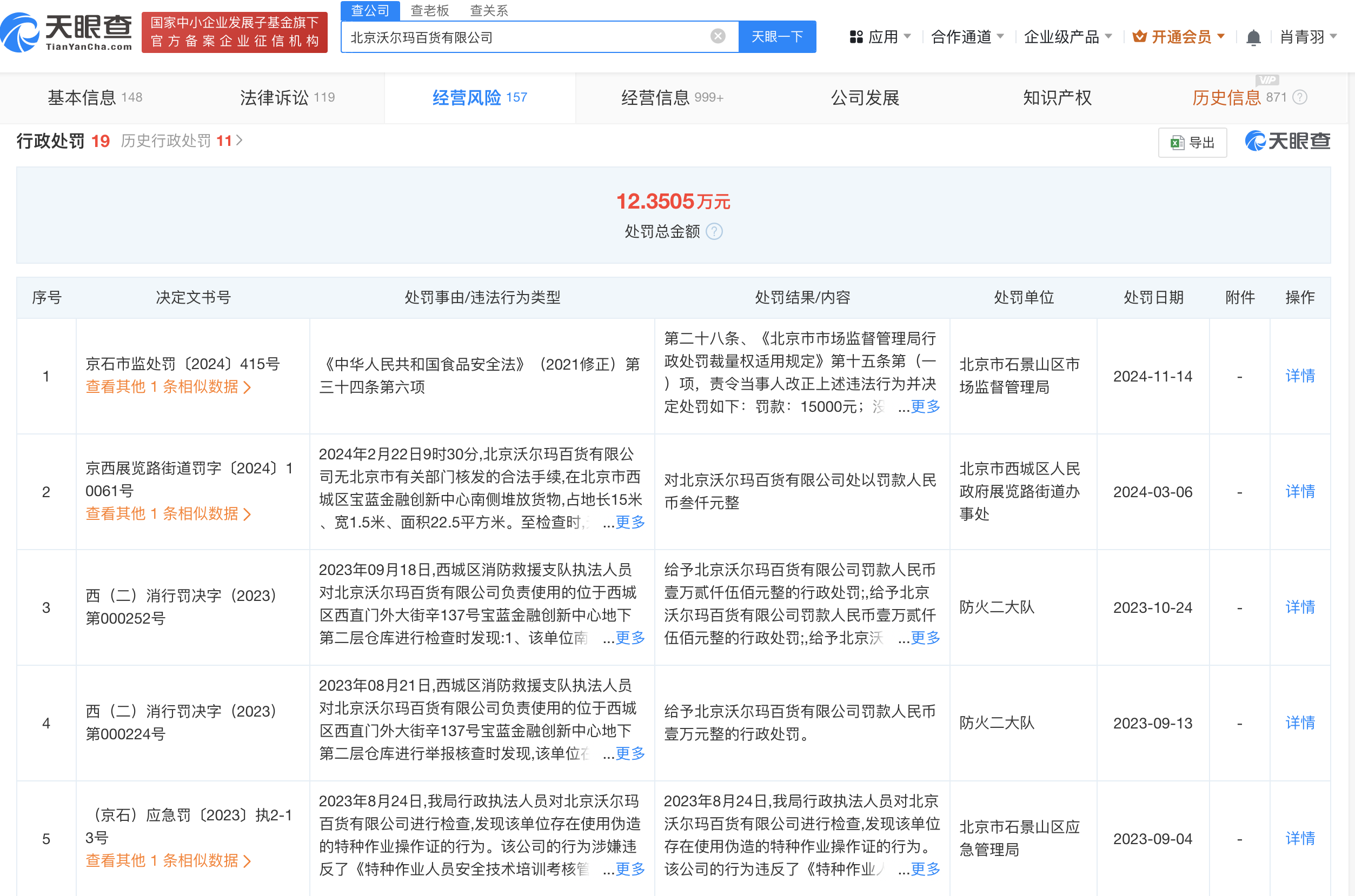 天眼查深度风险信息显示,近日,北京沃尔玛百货有限公司因经营涉嫌混有异物及感官性状异常的食品,被北京市石景山区市场监督管理局罚款1.5万元,并没收违法所得704.7元。