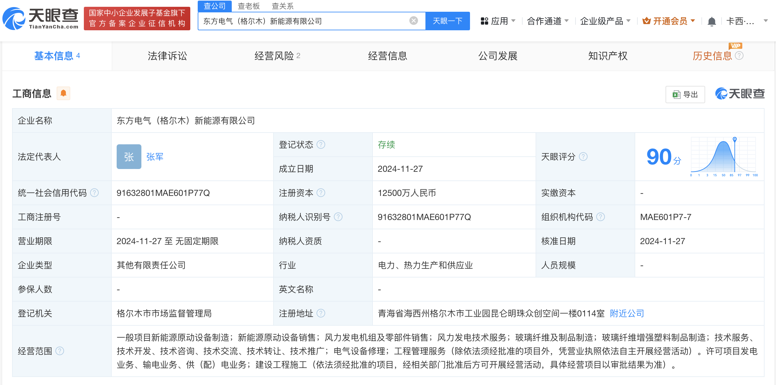 天眼查App显示,近日,东方电气(格尔木)新能源有限公司成立,法定代表人为张军,注册资本1.25亿人民币,经营范围含新能源原动设备制造、新能源原动设备销售、风力发电机组及零部件销售、风力发电技术服务等。股东信息显示,该公司由东方电气(600875)旗下东方电气风电股份有限公司以及格尔木昆鹏能源开发建设有限公司、青海格尔木工业园开发建设有限公司分别持股68%、24%、8%。