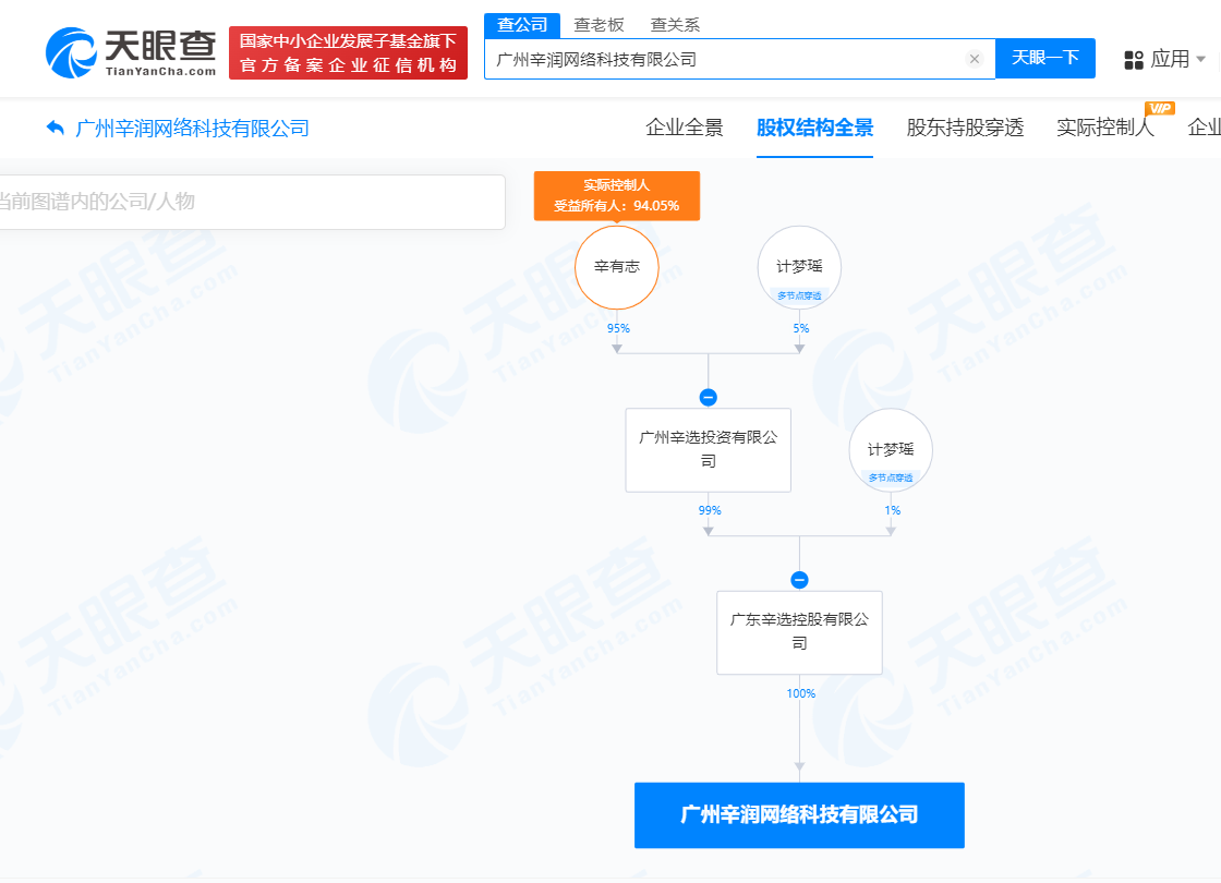 天眼查App显示,近日,广州辛润网络科技有限公司成立,法定代表人为计梦瑶,注册资本1500万人民币,经营范围含货物进出口、食品销售、汽车旧车销售、信息咨询服务、电子产品销售、日用品销售、互联网销售、非居住房地产租赁、文艺创作、组织文化艺术交流活动等。股权全景穿透图显示,该公司由广东辛选控股有限公司全资持股,受益所有人为辛有志(辛巴)。