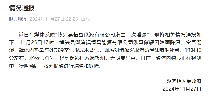 中新网11月28日电 据山东省滨州市博兴县湖滨镇人民政府官方微信公众号消息,近日有媒体反映“博兴县恒昌能源有限公司发生二次泄漏”,现将相关情况通报如下:11月25日17时,山东滨州博兴县湖滨镇恒昌能源有限公司涉事储罐因降雨降温、空气潮湿,罐体内热量与外部冷空气形成水蒸气,现场对储罐采取消防泡沫喷淋处置,19时30分左右,水蒸气消失。