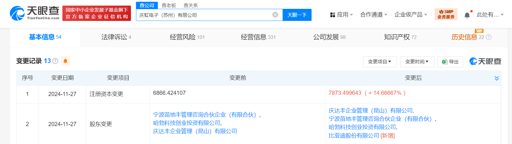 天眼查App显示,近日,庆虹电子(苏州)有限公司发生工商变更,新增比亚迪(002594)为股东,注册资本由约6866.4万人民币增至约7873.5万人民币,同时,部分主要人员也发生变更。