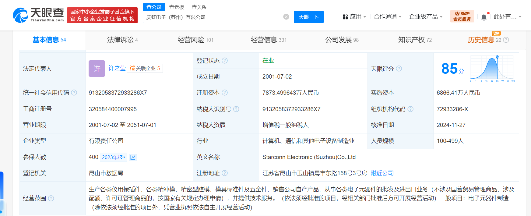 庆虹电子(苏州)有限公司成立于2001年7月,法定代表人为许之莹,经营范围含生产各类仪用接插件、各类精冲模、精密型腔模、模具标准件及五金件,销售公司自产产品,电子元器件制造等。股东信息显示,该公司现由庆达丰企业管理(昆山)有限公司、宁波苗地丰管理咨询合伙企业(有限合伙)、华为旗下哈勃科技创业投资有限公司及上述新增股东共同持股。