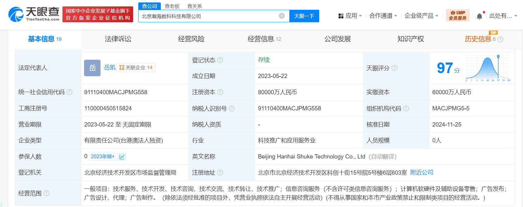 天眼查App显示,近日,北京瀚海数科科技有限公司发生工商变更,注册资本由6亿人民币增至8亿人民币。