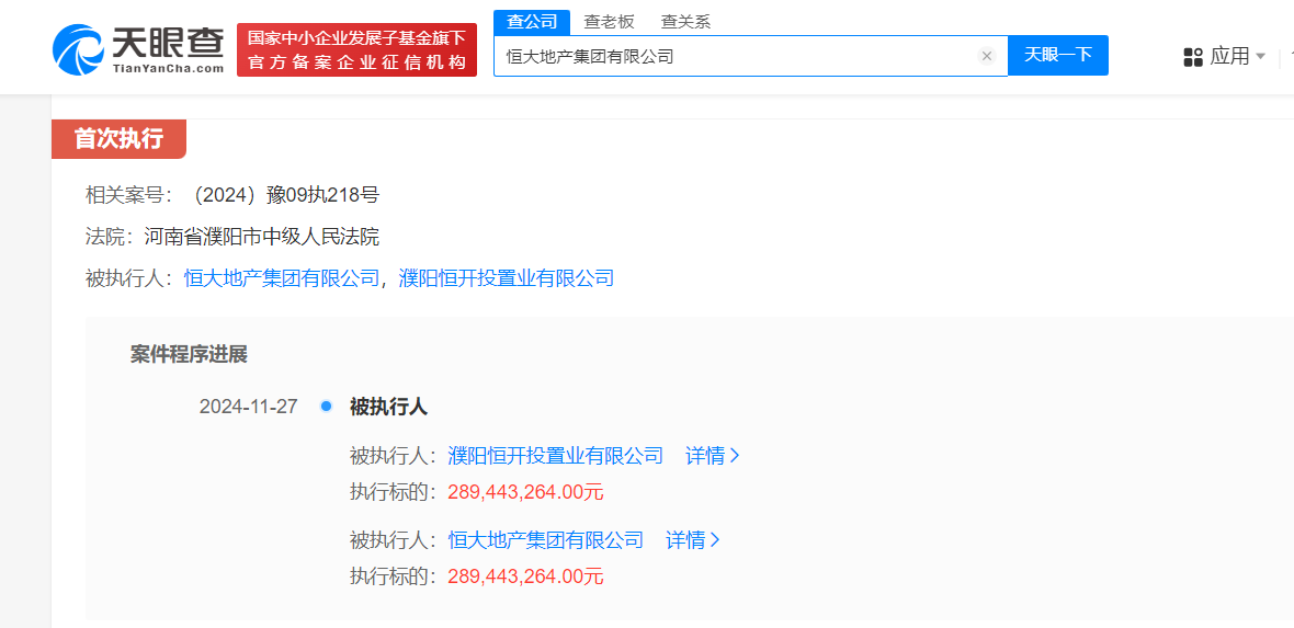天眼查法律诉讼信息显示,11月25日至27日,恒大地产集团有限公司新增5条被执行人信息,执行标的合计4.36亿余元,涉及建设工程施工合同纠纷、票据追索权纠纷、金融借款合同纠纷等案件,部分案件被执行人还包括濮阳恒开投置业有限公司、上饶大红鹰置业有限公司等,执行法院为河南省濮阳市中级人民法院、南昌市西湖区人民法院等。