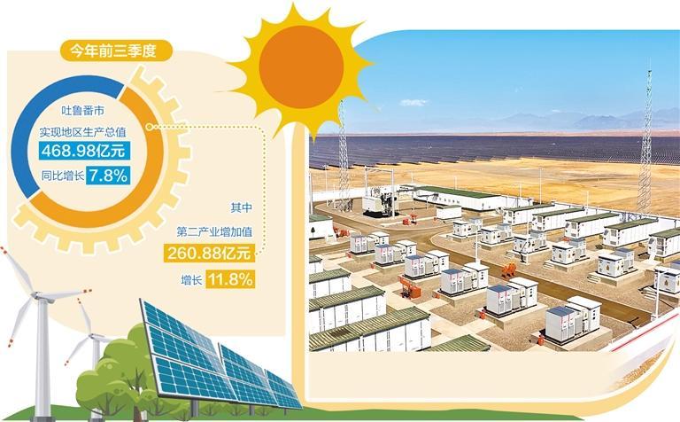 新疆吐鲁番光热资源十分丰富,年平均日照时数长达3200小时,夏日极端高温约50摄氏度。近年来,当地借助丰富的光热资源,大力开展高温干热汽车试验、夏季沙疗养生、特色设施农业等。尤其是今年以来,吐鲁番新兴产业陆续落地,传统产业提质升级、优势产业不断向好,呈现出“热力四射”的发展势头。数据显示,今年前三季度,吐鲁番市实现地区生产总值468.98亿元,按不变价格计算,同比增长7.8%;其中,第二产业增加值260.88亿元,增长11.8%。