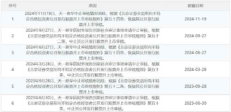 记者留意到,公开信息显示,天一恩华在北交所的IPO进程仍停留在2023年5月31日“已问询”阶段,此后至今约17个月并无进展,公司便陷入了因财报到期补充审计事项申请中止审核——中止审核情形消除——北交所恢复其IPO审核的循环中。