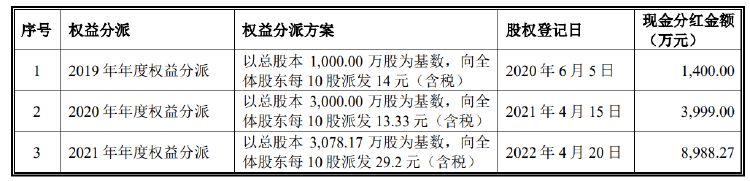 天一恩华介绍,报告期期初至今,公司共计现金分红三次,累计分红1.439亿元,具体情况如下: