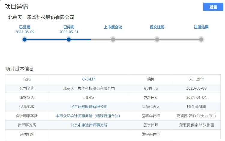 据北交所官网公开信息,11月19日,因中止审核情形(因财报到期补充审计事项)消除,北交所恢复北京天一恩华科技股份有限公司(以下简称天一恩华)公开发行股票并上市审核。