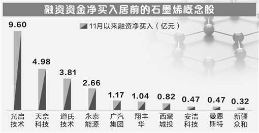 资金流向上来看,近期石墨烯概念股获得融资资金青睐,11月以来合计净流入23.2亿元,光启技术、天奈科技、道氏技术、永泰能源、广汽集团、翔丰华净流入居前,均在1亿元以上。