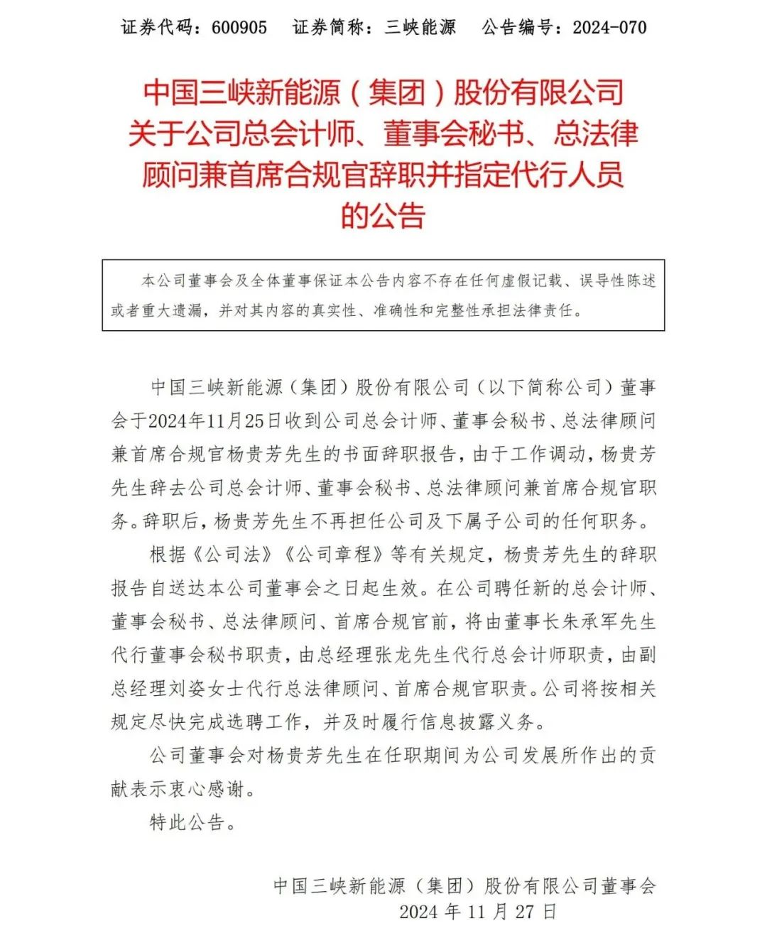 11月25日,三峡能源董事会收到公司总会计师、董事会秘书、总法律顾问兼首席合规官杨贵芳先生的书面辞职报告,由于工作调动,杨贵芳先生辞去公司总会计师、董事会秘书、总法律顾问兼首席合规官职务。辞职后,杨贵芳先生不再担任公司及下属子公司的任何职务。