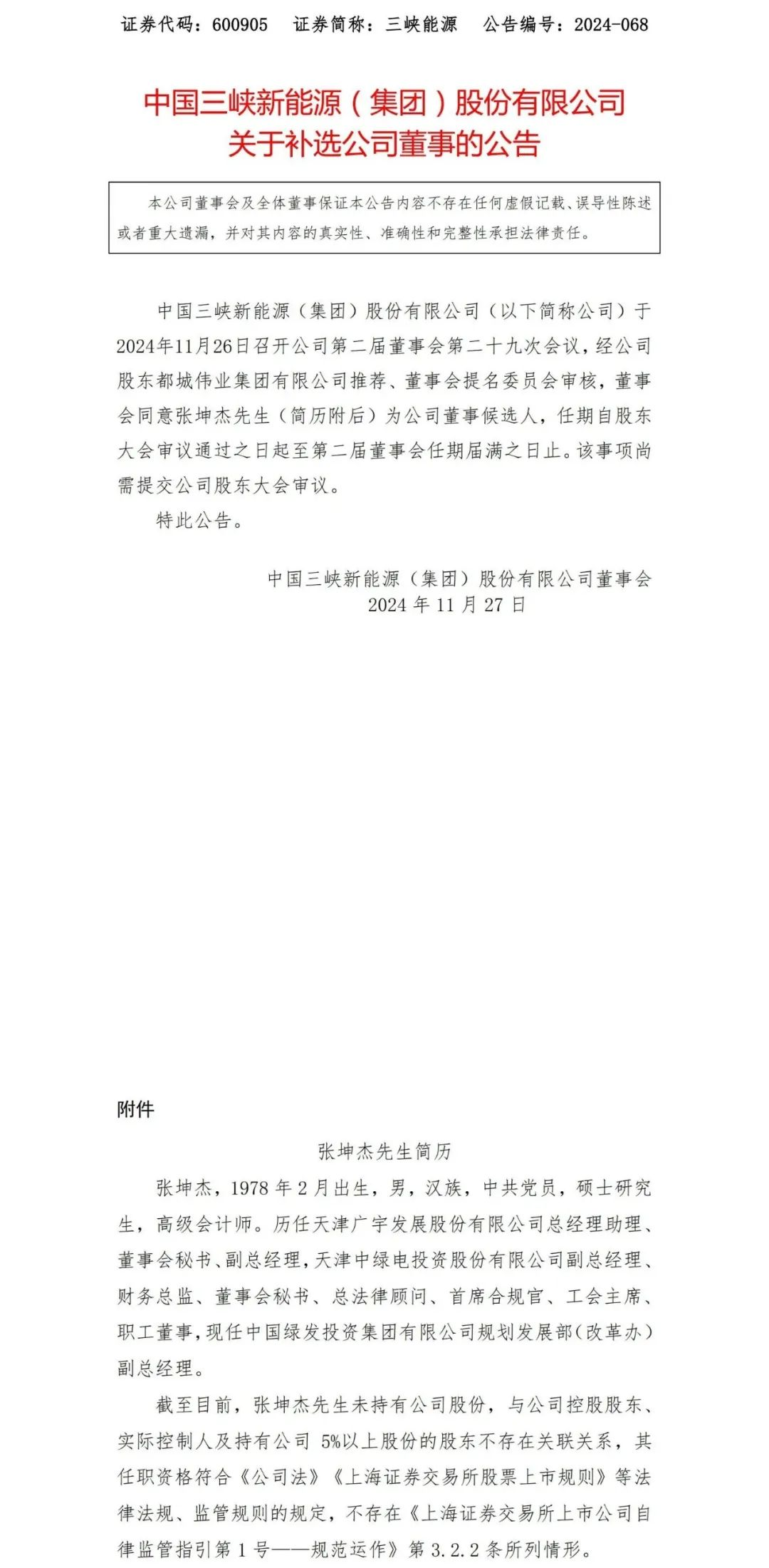 11月26日,三峡能源召开公司第二届董事会第二十九次会议,经公司股东都城伟业集团有限公司推荐、董事会提名委员会审核,董事会同意张坤杰先生为公司董事候选人,任期自股东大会审议通过之日起至第二届董事会任期届满之日止。该事项尚需提交公司股东大会审议。