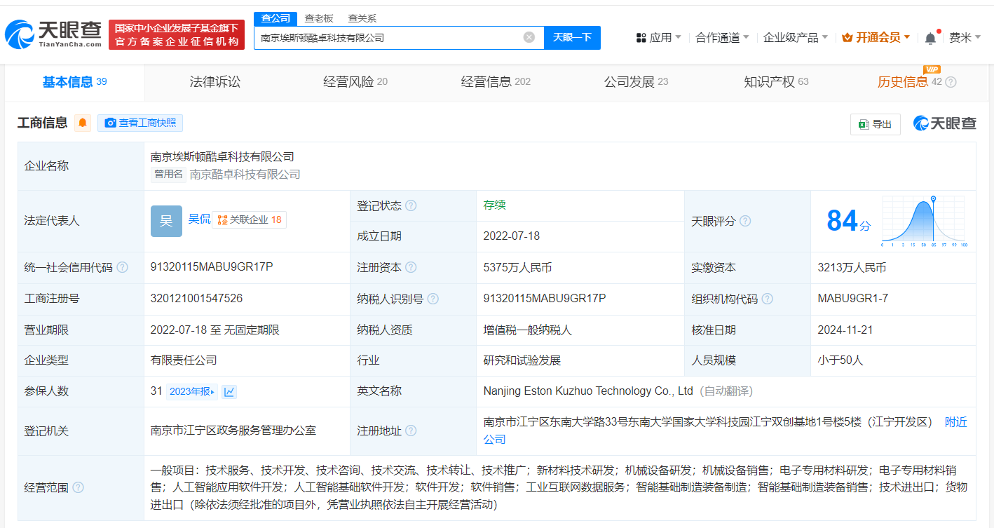 南京埃斯顿酷卓科技有限公司成立于2022年7月,法定代表人为吴侃,经营范围含新材料技术研发、机械设备研发、电子专用材料研发、人工智能应用软件开发、智能基础制造装备制造、智能基础制造装备销售等,现由南京派雷斯特科技有限公司、埃斯顿(002747)、南京酷卓协同企业管理合伙企业(有限合伙)及上述新增股东等共同持股。据媒体报道,近期江苏省战略性新兴产业母基金首批产业专项基金对首个直投项目——南京埃斯顿酷卓科技有限公司完成投资协议签署。据悉,埃斯顿酷卓是埃斯顿的孵化企业。