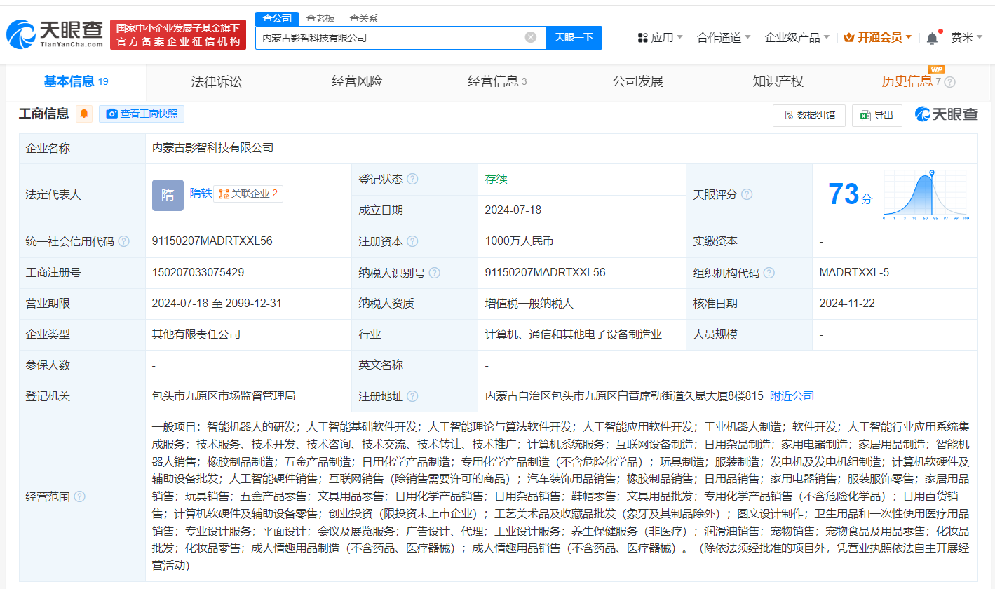 内蒙古影智科技有限公司成立于2024年7月,法定代表人为隋轶,注册资本1000万人民币,经营范围含智能机器人的研发、人工智能基础软件开发、人工智能应用软件开发、工业机器人制造、计算机系统服务、互联网设备制造等,现由北京影智科技有限公司、内蒙古深原科创研发有限公司及上述新增股东等共同持股。公开资料显示,该公司致力于人型机器人、AI陪伴机器人、智慧文创及大健康产业相关产品的研发和推广。