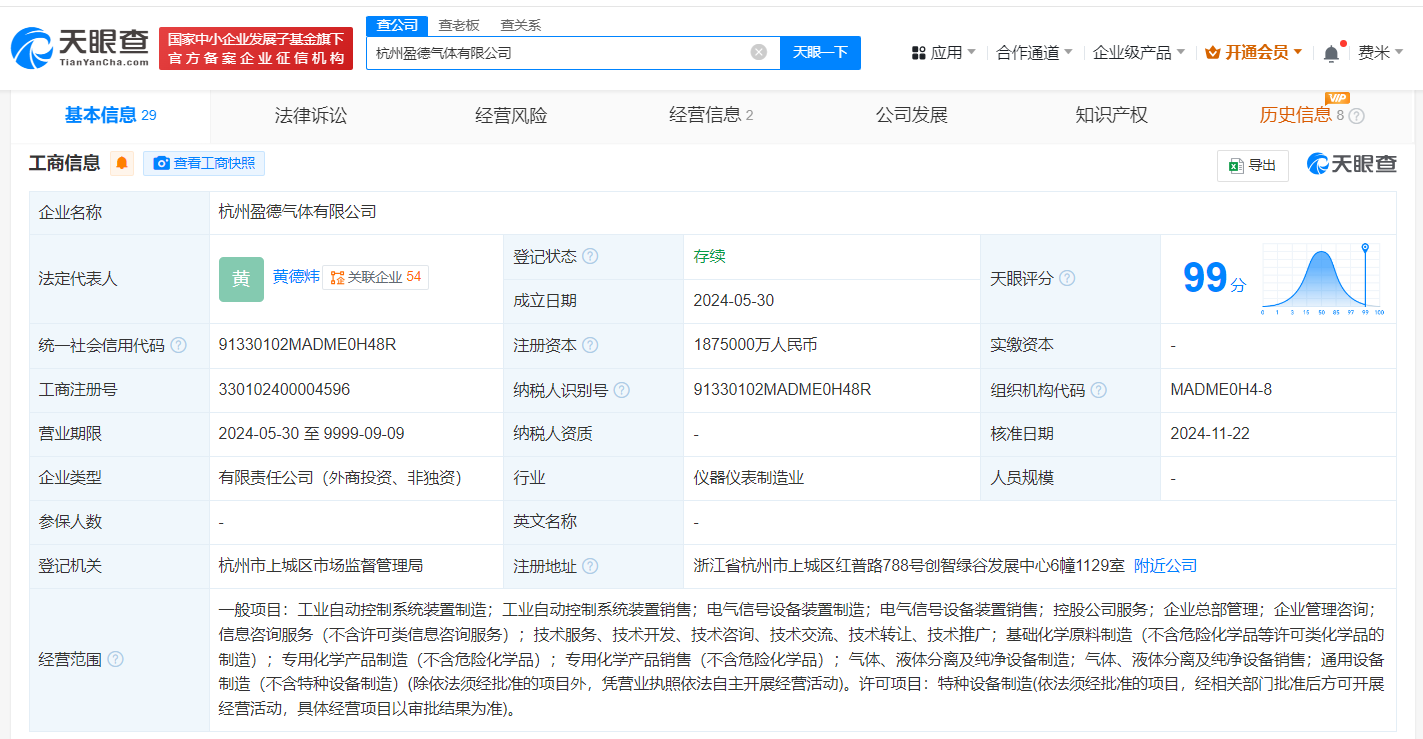 杭州盈德气体有限公司成立于今年5月,法定代表人为黄德炜,经营范围含工业自动控制系统装置制造、工业自动控制系统装置销售、电气信号设备装置制造、电气信号设备装置销售、控股公司服务、企业总部管理等,现由TIGER ROCK PTE. LTD.及上述新增股东共同持股。