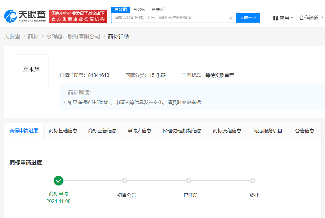 天眼查知识产权信息显示,近日,永辉超市(601933)申请注册一枚“胖永辉”商标,国际分类为乐器,目前该商标状态为等待实质审查。