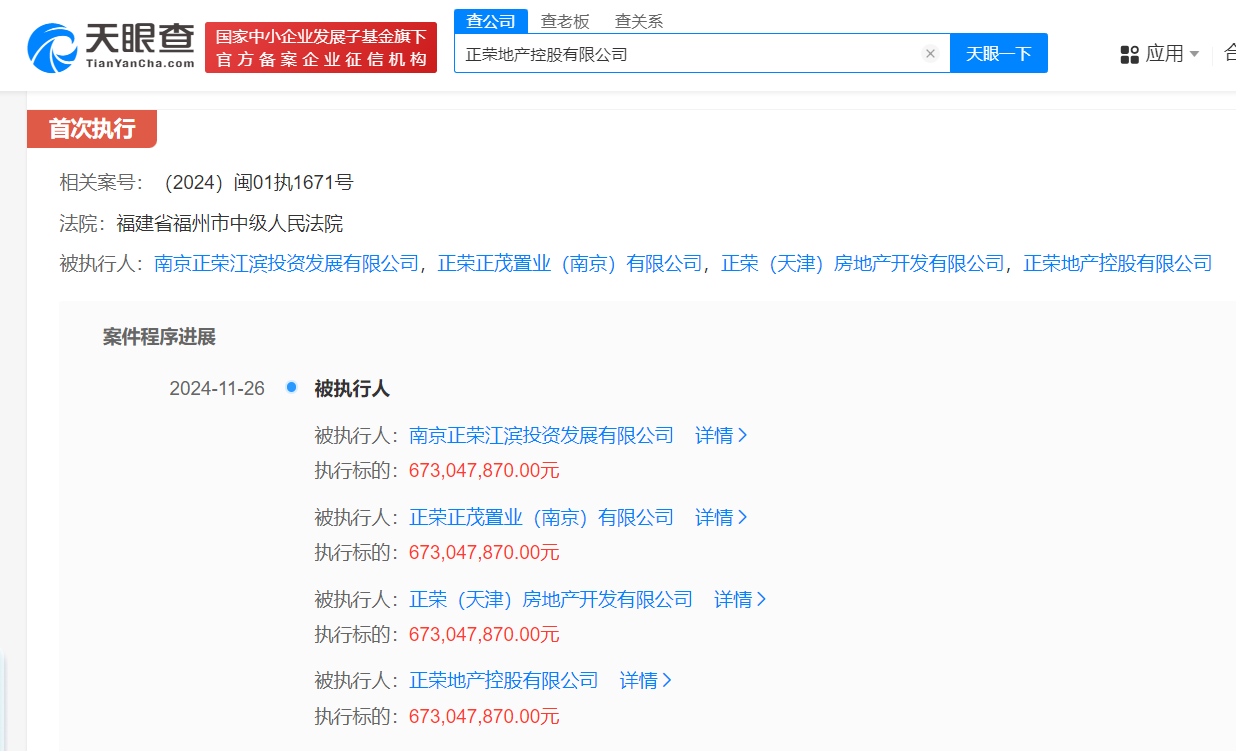 天眼查法律诉讼信息显示,近日,正荣地产控股有限公司及旗下南京正荣江滨投资发展有限公司、正荣正茂置业(南京)有限公司、正荣(天津)房地产开发有限公司新增一则被执行人信息,执行标的6.73亿余元,执行法院为福建省福州市中级人民法院。