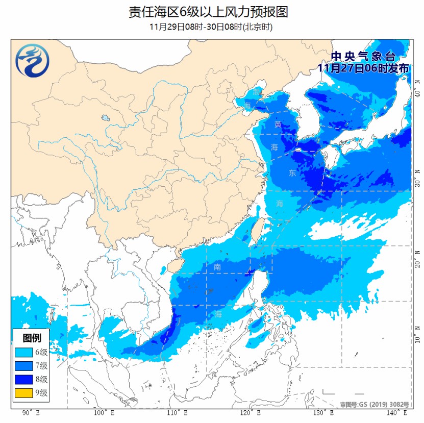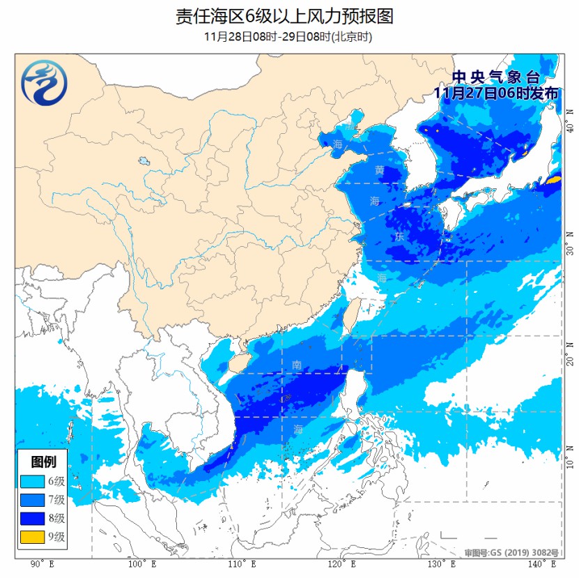 中新网11月27日电 据中央气象台网站消息,26日14时至27日02时,渤海、渤海海峡、黄海大部海域、东海北部海域出现了6~8级、阵风9~10级的偏西风或西北风,其中黄海中部部分海域出现了9级、阵风10级的大风,东海南部海域、台湾海峡、台湾以东洋面、巴士海峡、南海北部和西部海域、北部湾、琼州海峡出现了6~8级、阵风9级的东北风或偏北风。
