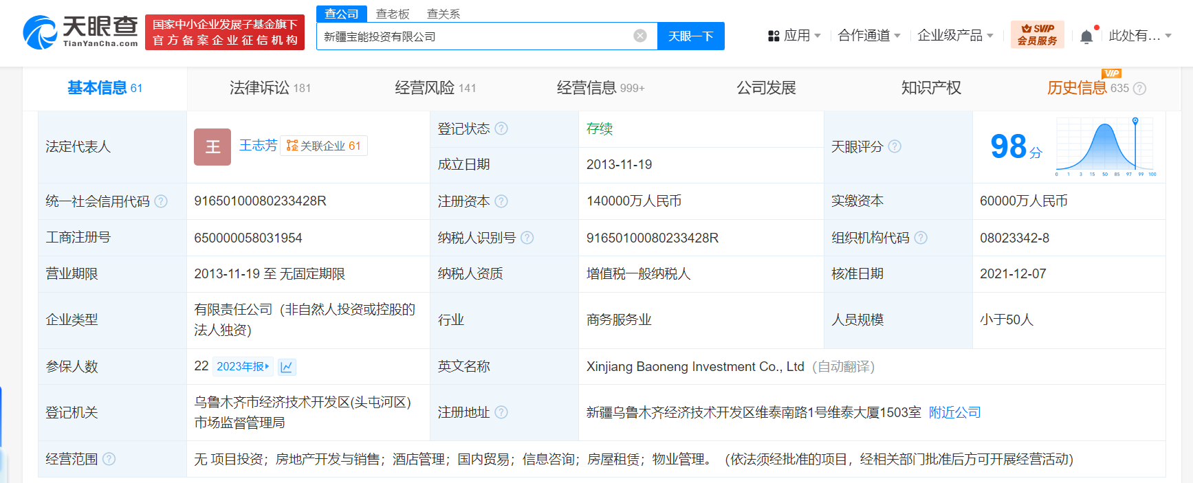 新疆宝能投资有限公司成立于2013年11月,法定代表人为王志芳,注册资本14亿人民币,由宝能地产股份有限公司全资持股。