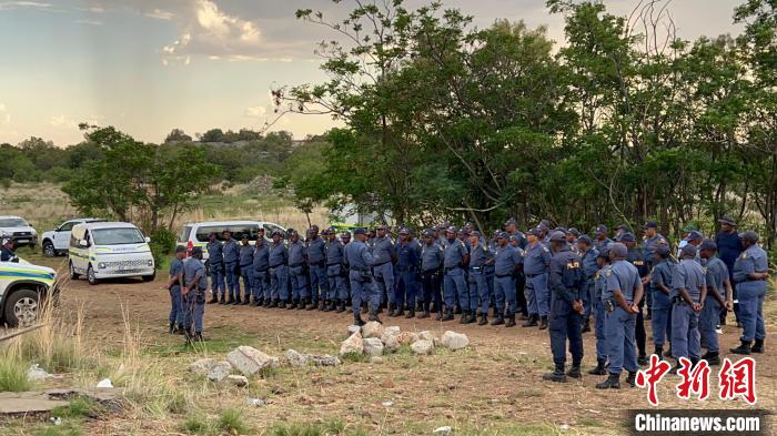 当地时间11月19日,南非警方在西北省史蒂尔方丹(Stilfontein)废弃矿井周边看守。中新社记者 孙翔 摄
