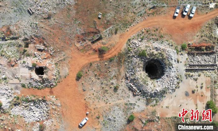 当地时间11月19日,南非西北省史蒂尔方丹(Stilfontein)废弃矿井入口航拍图。 吴勤坚 摄