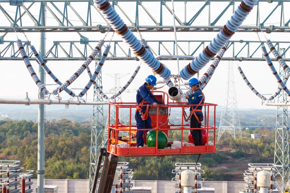 11月8日,在位于湖南省衡南县泉湖镇的衡阳换流站,电力工人在安装绝缘球。新华社记者陈思汗 摄