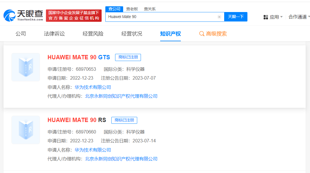 值得一提的是,华为技术有限公司还于同时期申请注册了“HUAWEI MATE 80 GTS”“HUAWEI MATE 80 RS”“HUAWEI MATE 90 GTS”“HUAWEI MATE 90 RS”“HUAWEI MATE 100 GTS”“HUAWEI MATE 100 RS”商标,国际分类均为科学仪器,上述商标均于去年7月成功注册。