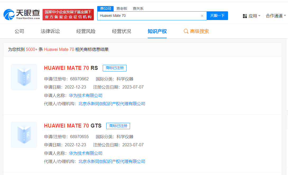天眼查知识产权信息显示,华为技术有限公司曾于2022年12月申请注册“HUAWEI MATE 70 GTS”“HUAWEI MATE 70 RS”商标,国际分类为科学仪器,上述商标均于去年7月成功注册。