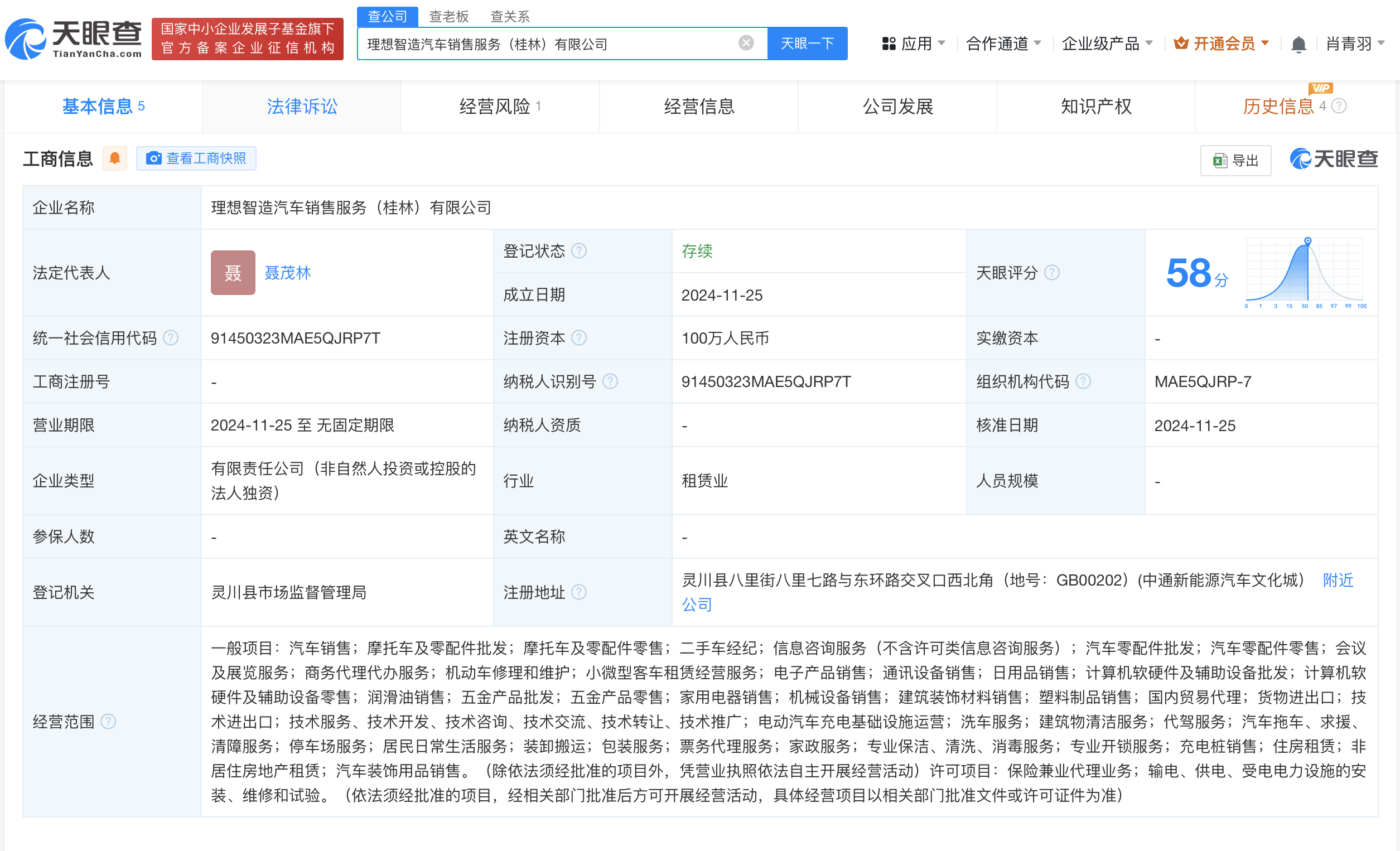 天眼查App显示,近日,理想智造汽车销售服务(桂林)有限公司成立,法定代表人为聂茂林,注册资本100万人民币,经营范围含汽车销售、摩托车及零配件批发、摩托车及零配件零售、二手车经纪、汽车零配件批发、汽车零配件零售等。股权全景穿透图显示,该公司由北京励鼎汽车销售有限公司全资持股,后者为理想汽车旗下Leading Ideal HK Limited全资子公司。