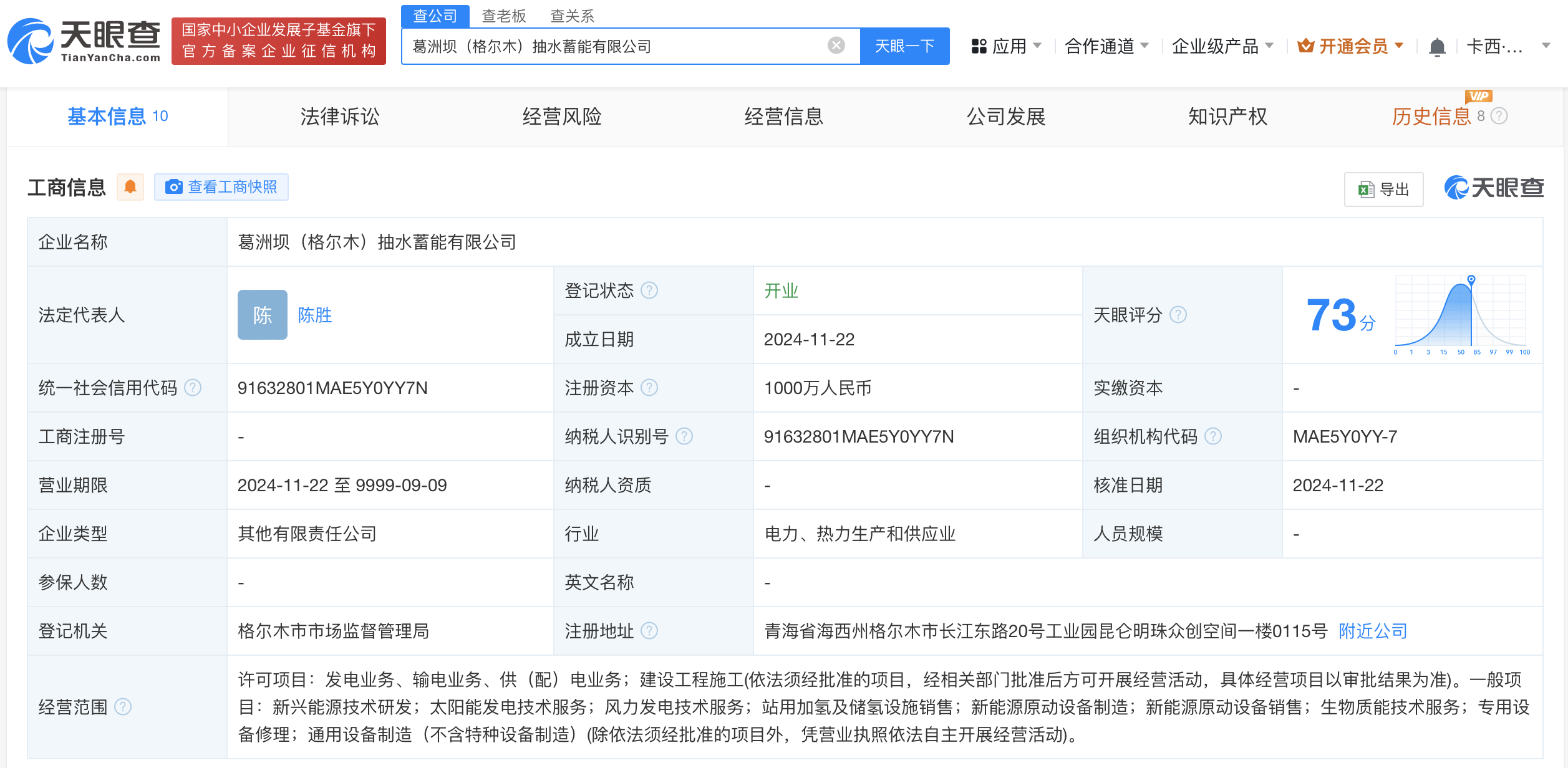 天眼查App显示,近日,葛洲坝(格尔木)抽水蓄能有限公司成立,法定代表人为陈胜,注册资本1000万人民币,经营范围含新兴能源技术研发、太阳能发电技术服务、风力发电技术服务、站用加氢及储氢设施销售等。股东信息显示,该公司由海西州国有资本投资运营(集团)有限公司、中国葛洲坝集团股份有限公司共同持股。