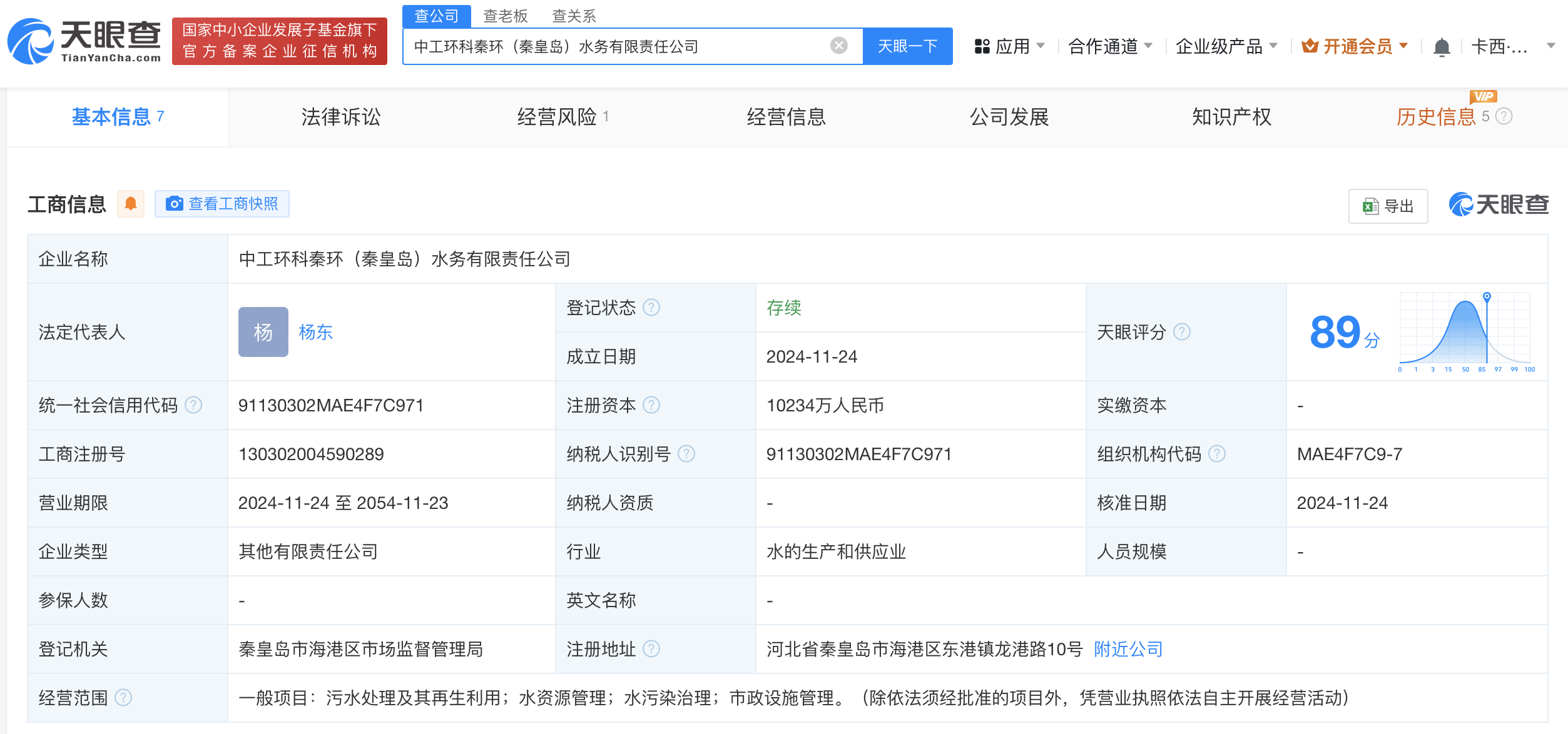 天眼查App显示,近日,中工环科秦环(秦皇岛)水务有限责任公司成立,法定代表人为杨东,注册资本约1.02亿人民币,经营范围为污水处理及其再生利用、水资源管理、水污染治理、市政设施管理。股权全景穿透图显示,该公司由中工国际(002051)旗下中工环境科技有限公司、秦皇岛环保产业集团有限公司分别持股95%、5%。