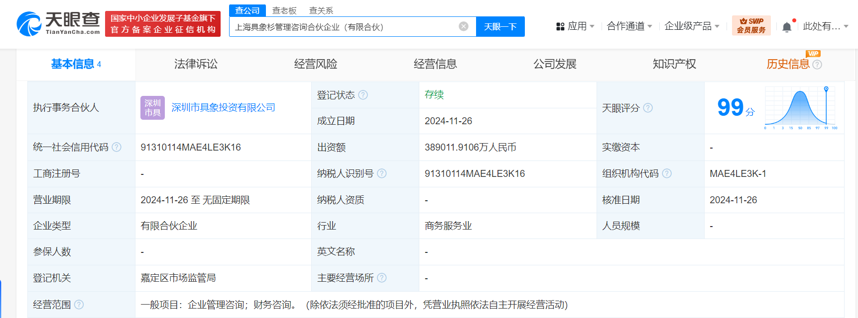 天眼查App显示,近日,上海具象杉管理咨询合伙企业(有限合伙)成立,执行事务合伙人为深圳市具象投资有限公司,出资额约38.9亿人民币,经营范围为企业管理咨询、财务咨询。合伙人信息显示,该企业由杉杉集团有限公司、杉杉控股有限公司、深圳市百宏成长投资管理有限公司、深圳市具象投资有限公司共同出资。