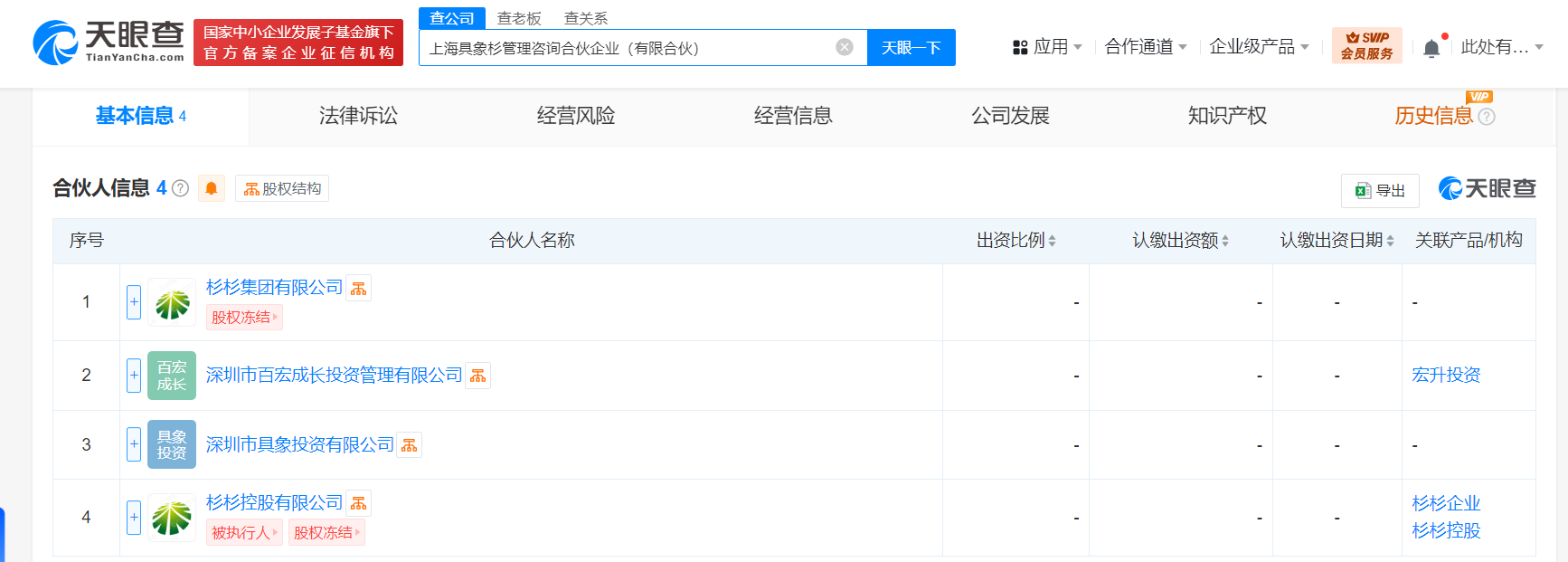 天眼查App显示,近日,上海具象杉管理咨询合伙企业(有限合伙)成立,执行事务合伙人为深圳市具象投资有限公司,出资额约38.9亿人民币,经营范围为企业管理咨询、财务咨询。合伙人信息显示,该企业由杉杉集团有限公司、杉杉控股有限公司、深圳市百宏成长投资管理有限公司、深圳市具象投资有限公司共同出资。