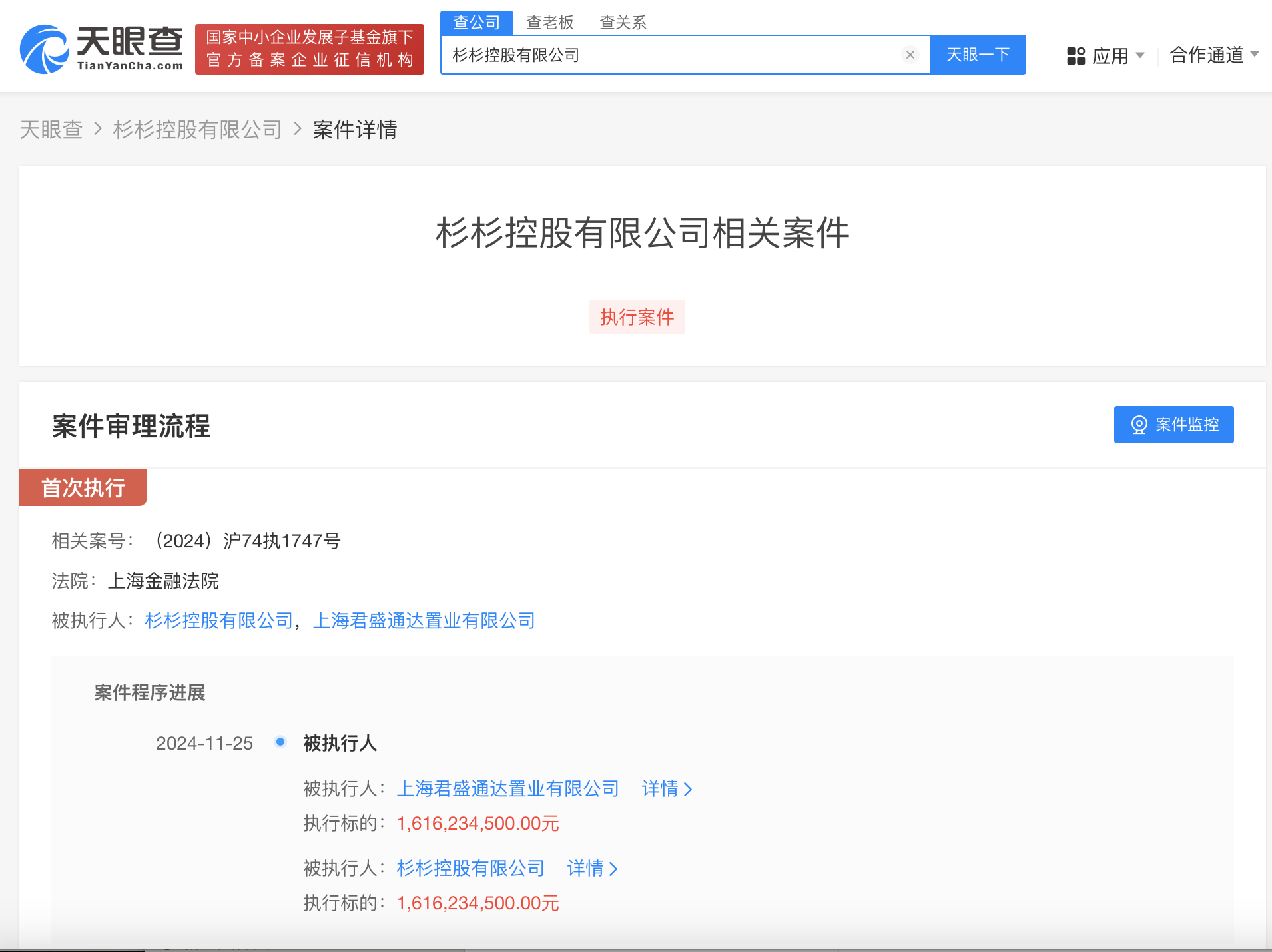 天眼查法律诉讼信息显示,11月25日,杉杉控股有限公司、上海君盛通达置业有限公司新增1条被执行人信息,执行标的16.16亿余元,执行法院为上海金融法院。