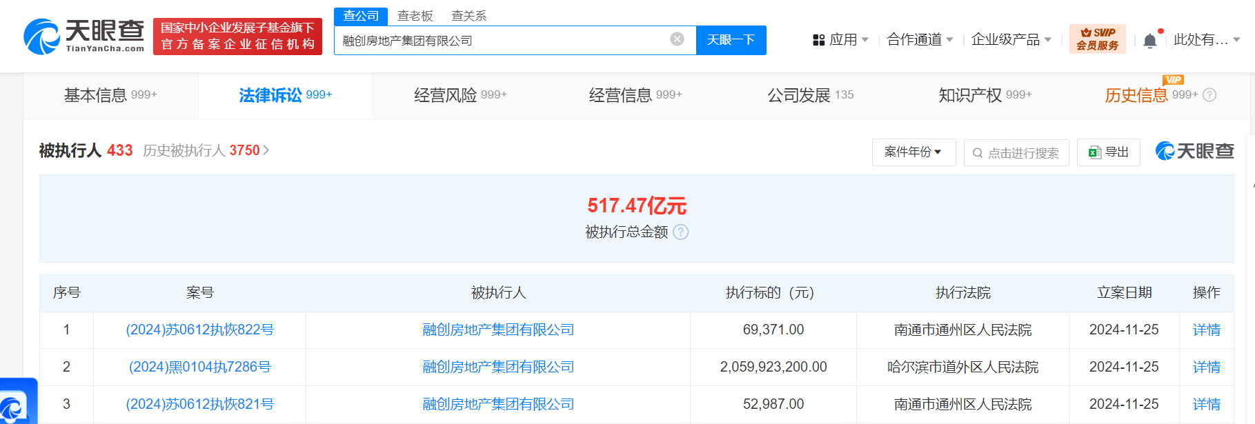 天眼查法律诉讼信息显示,近日,融创房地产集团有限公司新增3条被执行人和恢复执行信息,执行标的合计20.6亿余元,涉及票据追索权纠纷等案件,部分案件被执行人还包括天津星耀投资有限公司、融创华北发展集团有限公司等,执行法院包括哈尔滨市道外区人民法院、南通市通州区人民法院。