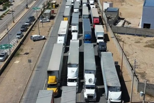 △自墨西哥准备入境美国的货运卡车(资料图)
