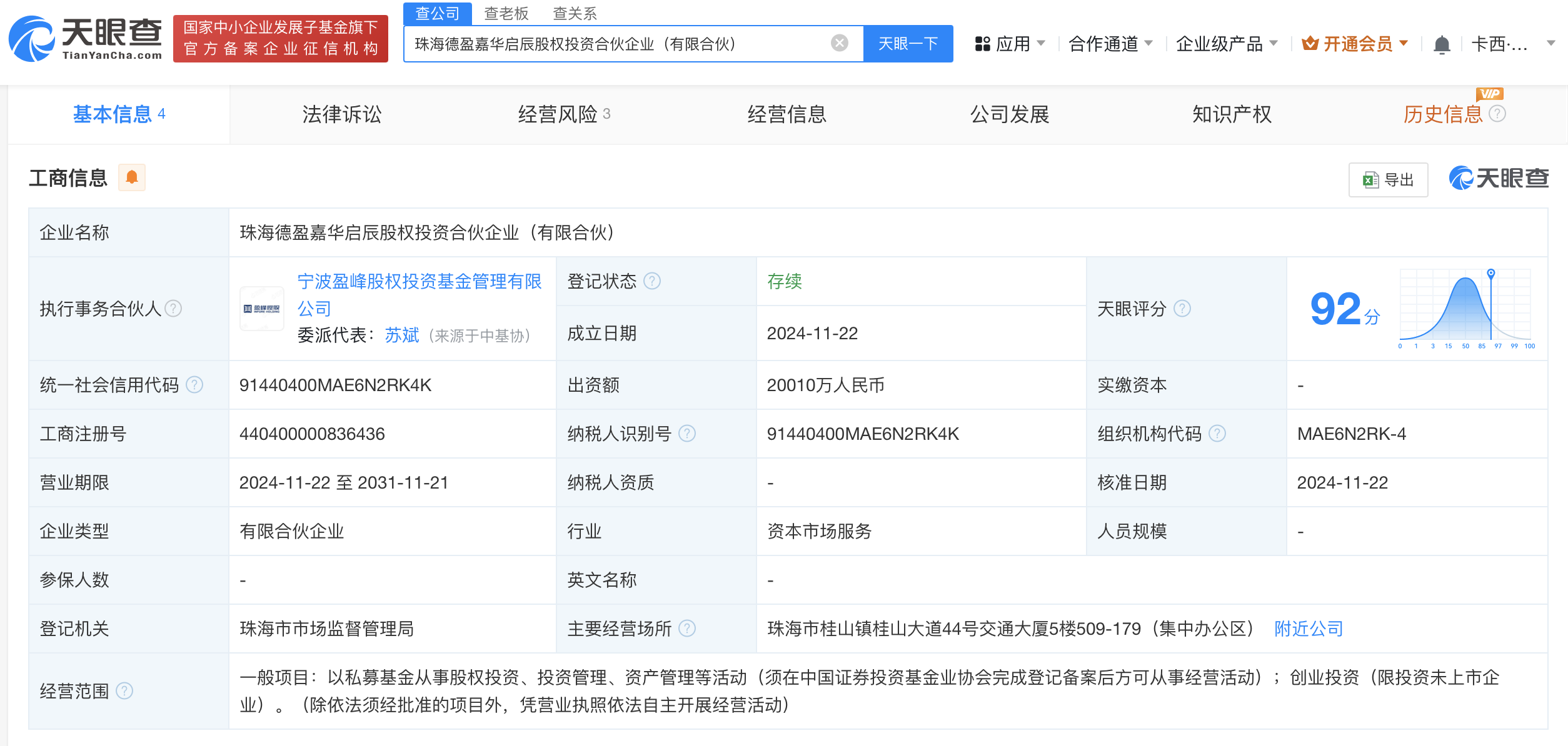 天眼查App显示,近日,珠海德盈嘉华启辰股权投资合伙企业(有限合伙)成立,执行事务合伙人为宁波盈峰股权投资基金管理有限公司,注册资本约2亿人民币,经营范围为以私募基金从事股权投资、投资管理、资产管理等活动,创业投资。合伙人信息显示,该企业由德阳投控兴产投资有限责任公司、英杰电气(300820)、华体科技(603679)、宁波盈峰股权投资基金管理有限公司共同出资。