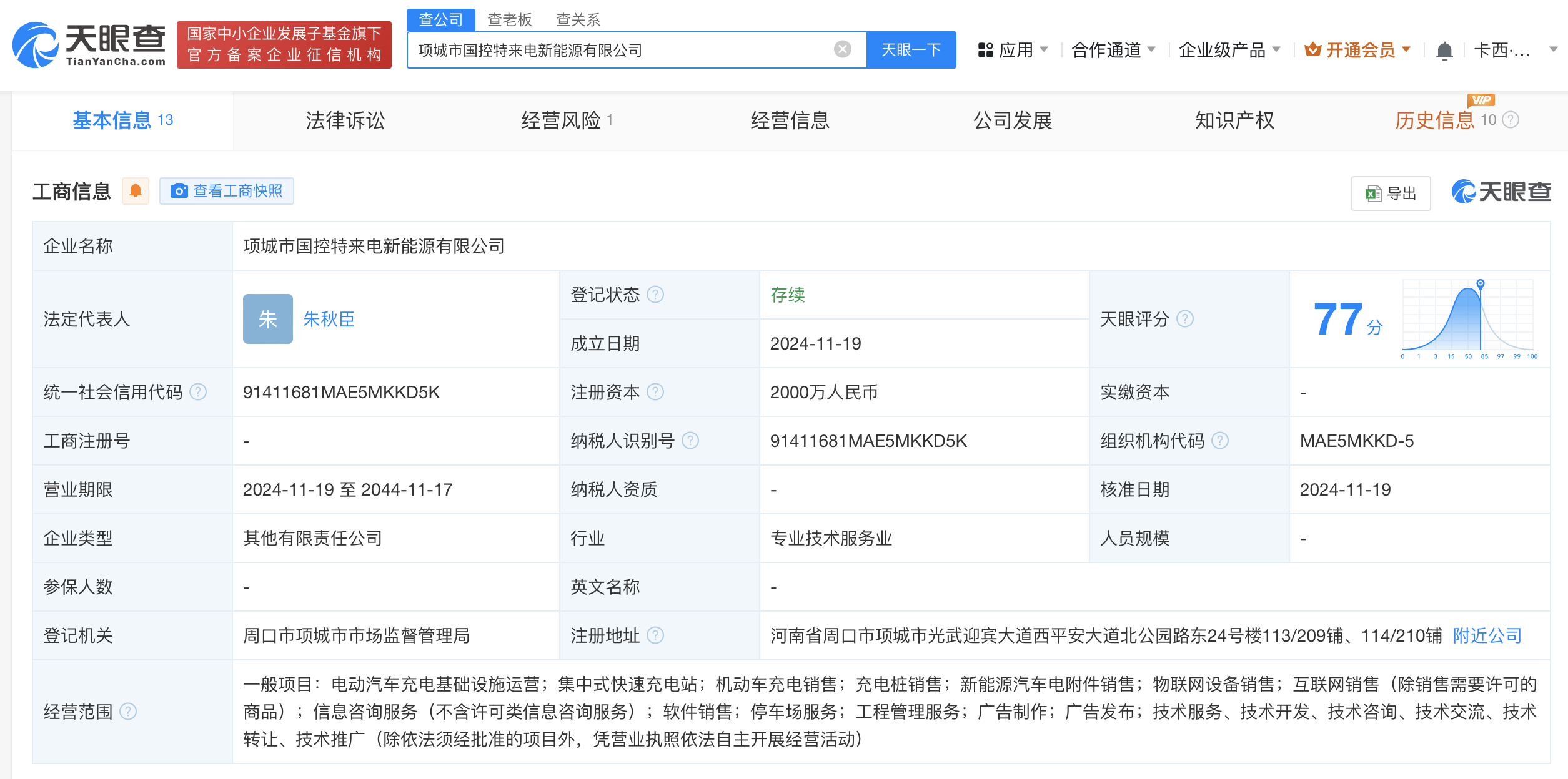 天眼查App显示,近日,项城市国控特来电新能源有限公司成立,法定代表人为朱秋臣,注册资本2000万人民币,经营范围含电动汽车充电基础设施运营、集中式快速充电站、机动车充电销售、充电桩销售等。股东信息显示,该公司由项城市国有资产控股管理集团有限公司、特来电新能源股份有限公司分别持股67%、33%。