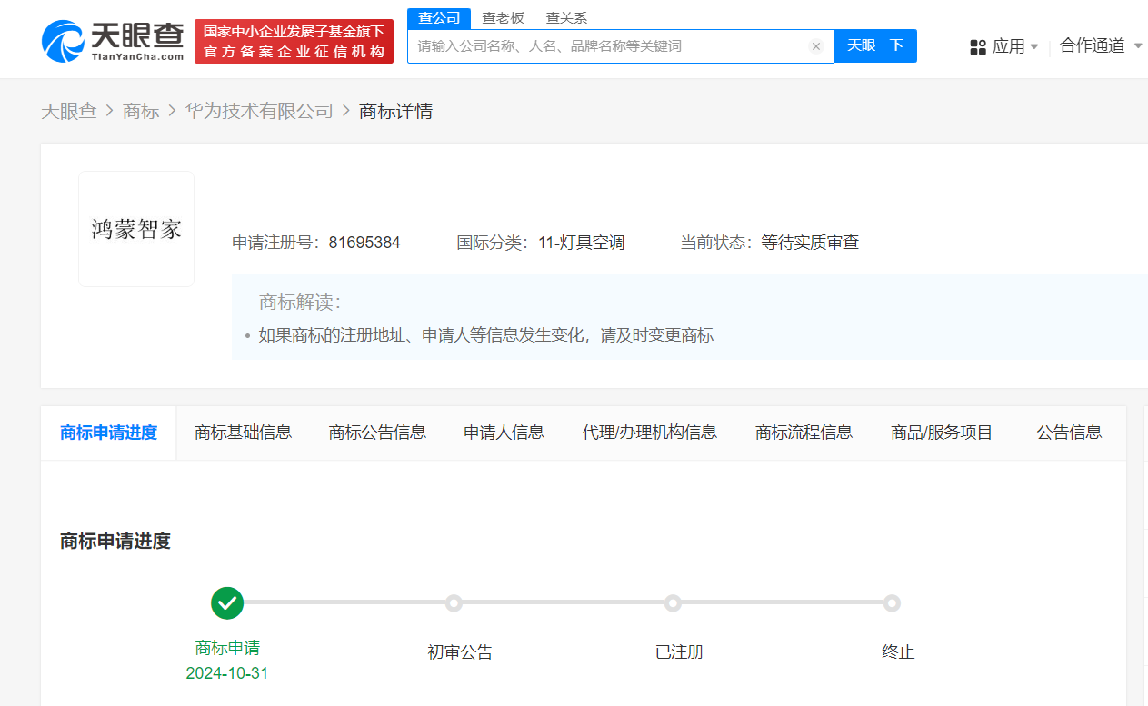 天眼查知识产权信息显示,近日,华为技术有限公司申请注册多枚“鸿蒙智家”商标,国际分类涉及灯具空调、运输工具、建筑修理等,当前商标状态均为等待实质审查。