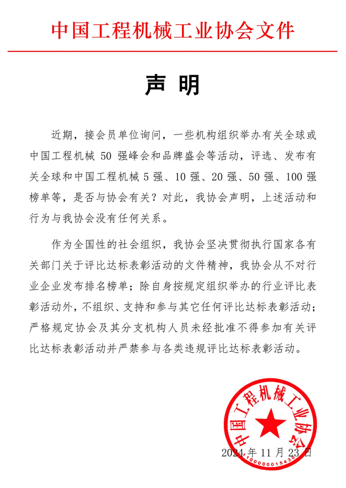 11月24日,中国工程机械工业协会官微发布声明称,协会从不对行业企业发布排名榜单;除自身按规定组织举办的行业评比表彰活动外,不组织、支持和参与其他任何评比达标表彰活动;严格规定协会及其分支机构人员未经批准不得参加有关评比达标表彰活动并严禁参与各类违规评比达标表彰活动。