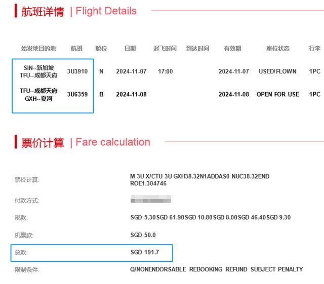 电子客票行程确认单显示,这两个航段(新加坡—中国成都、成都天府—甘南夏河)在同一票号下,票价总款为191.7新加坡元,约合人民币1035元。