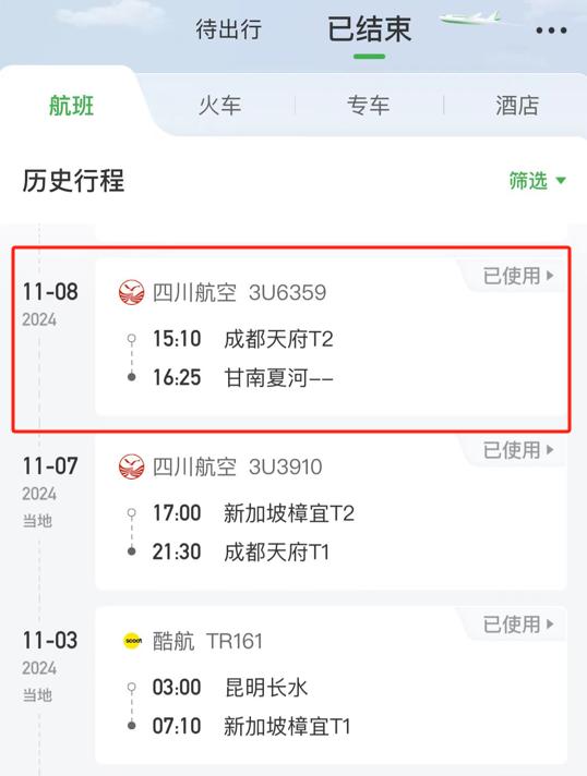 航旅纵横截图显示,除了谭女士主动购买的中国往返新加坡的两张机票外,她的名下还多了一张“机票”——11月8日从成都天府国际机场飞往甘南夏河机场的3U6395航班。