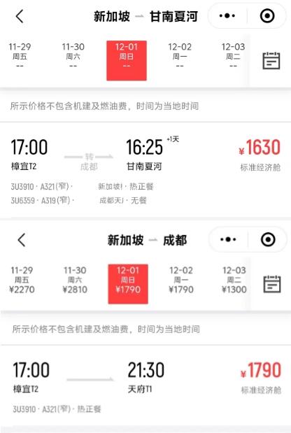12月1日,从新加坡樟宜机场直飞成都天府国际机场,标准经济舱的价格为1790元;若选择从新加坡飞往成都、次日抵达甘南夏河机场的联程机票,标准经济舱则为1630元。