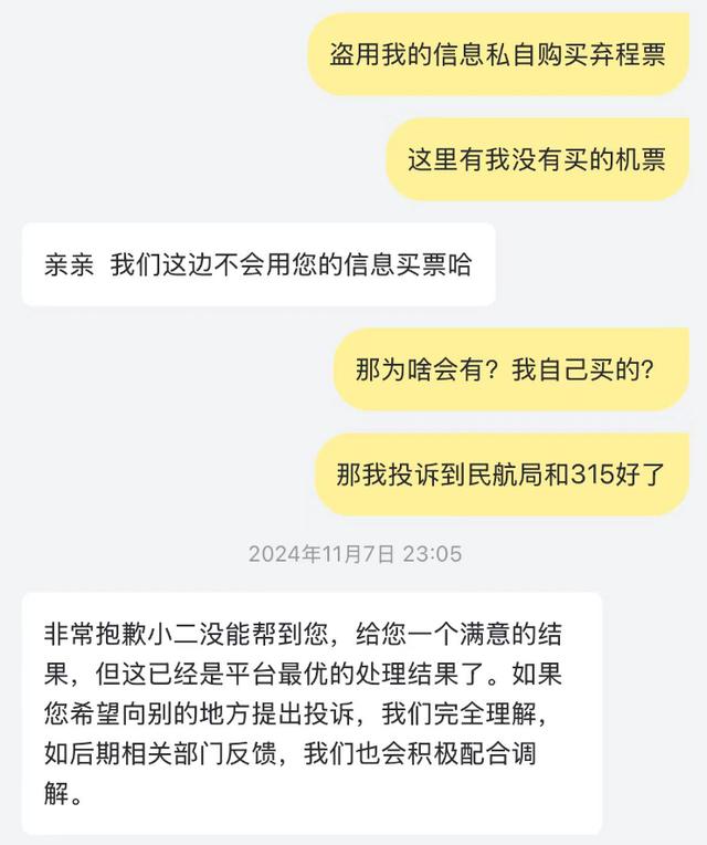 11月7日,谭女士联系飞猪客服,质疑平台方盗用她的信息私自购买机票。客服向她解释称,“我们这边不会(盗)用您的信息买票哈”,但其始终未正面回应为何会多一张“机票”。