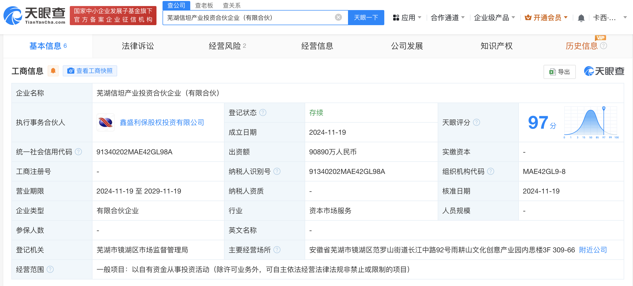 天眼查App显示,近日,芜湖信坦产业投资合伙企业(有限合伙)成立,执行事务合伙人为鑫盛利保股权投资有限公司,出资额约9.09亿人民币,经营范围为以自有资金从事投资活动。股权全景穿透图显示,该公司由盐城咏恒资产管理有限公司、中国信达(HK.01359)及旗下鑫盛利保股权投资有限公司共同出资。