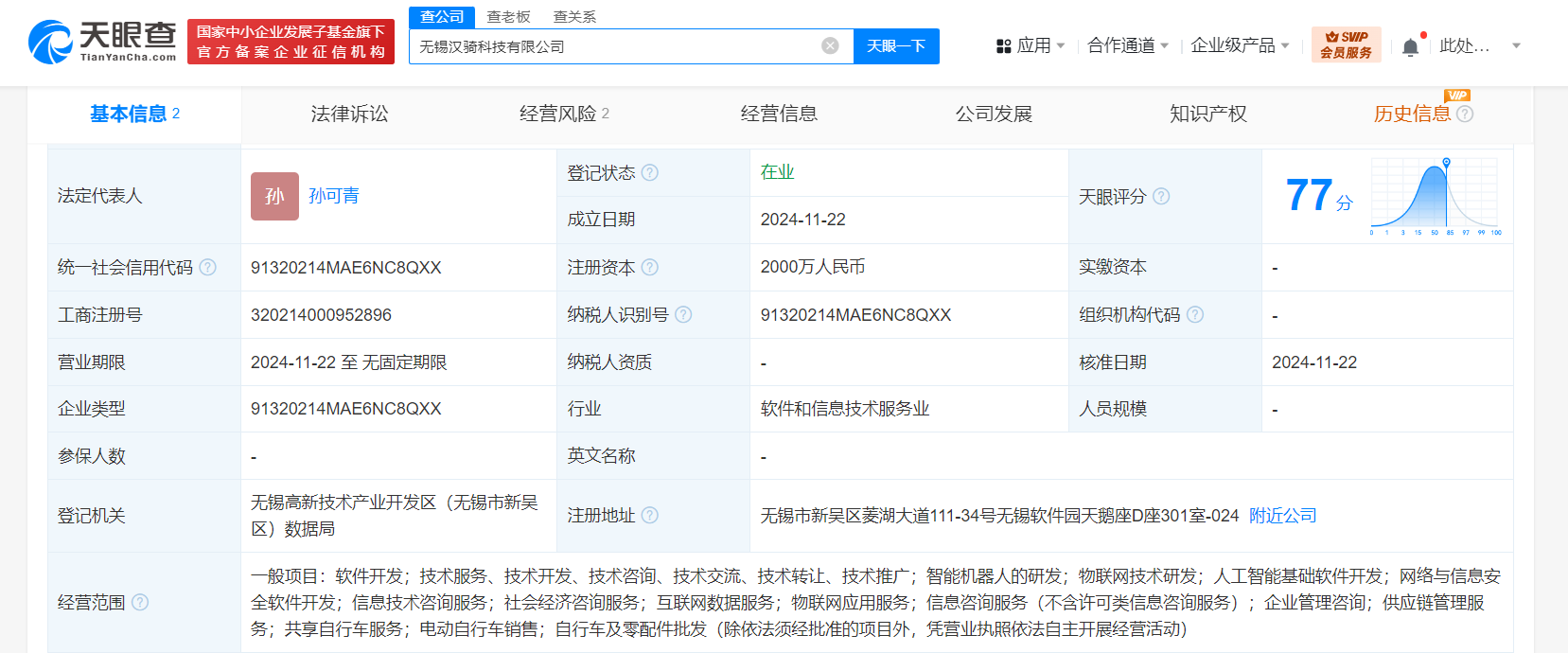 天眼查App显示,近日,无锡汉骑科技有限公司成立,法定代表人为孙可青,注册资本2000万人民币,经营范围含智能机器人的研发、物联网技术研发、人工智能基础软件开发、网络与信息安全软件开发、信息技术咨询服务、物联网应用服务等。股权全景穿透图显示,该公司由汉海信息技术(上海)有限公司全资持股,后者为美团旗下Solid Bit Hong Kong Limited全资子公司。