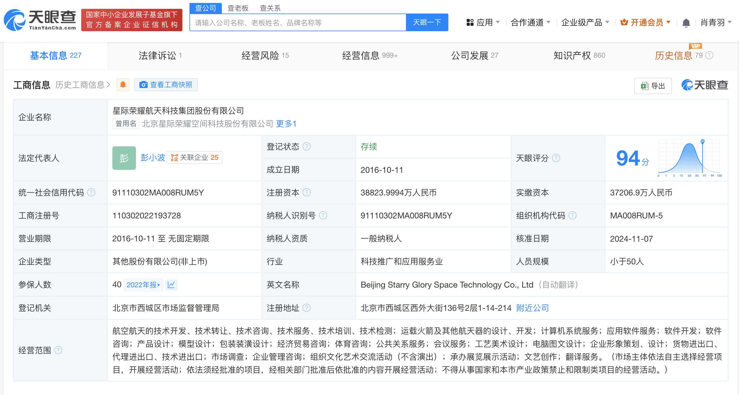 该公司成立于2016年10月,法定代表人为彭小波,注册资本约3.9亿人民币,经营范围含航空航天的技术开发、技术转让、技术咨询、技术服务、技术培训、技术检测等。股东信息显示,该公司由连云港惟聪企业管理合伙企业(有限合伙)、北京聚信锦翔企业管理合伙企业(有限合伙)、连云港俊德企业管理合伙企业(有限合伙)等共同持股。