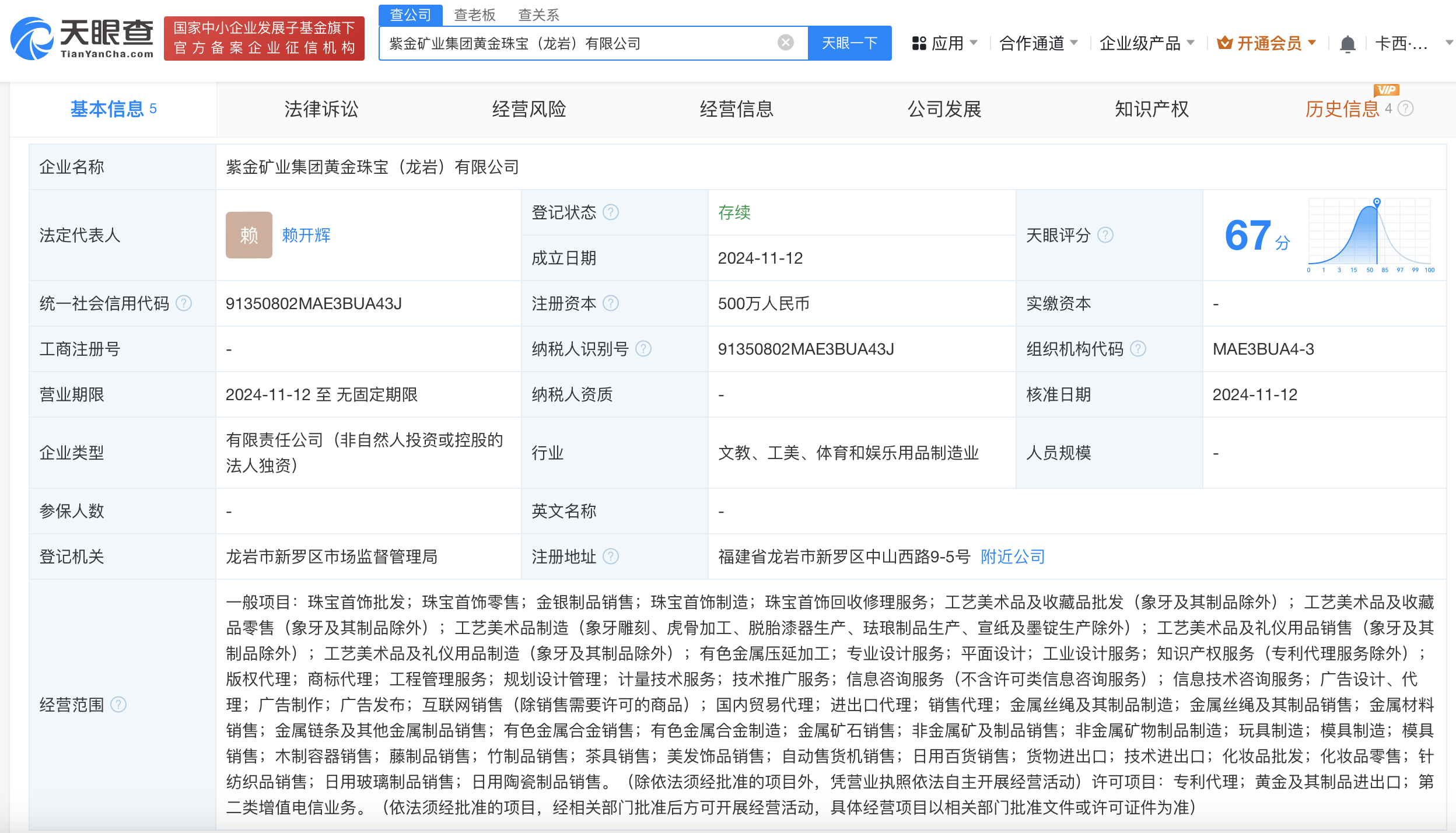 天眼查App显示,近日,紫金矿业集团黄金珠宝(龙岩)有限公司成立,法定代表人为赖开辉,注册资本500万人民币,经营范围含珠宝首饰零售、金银制品销售、有色金属合金销售、金属矿石销售等。股东信息显示,该公司由紫金矿业(601899)旗下紫金矿业集团黄金珠宝有限公司全资持股。