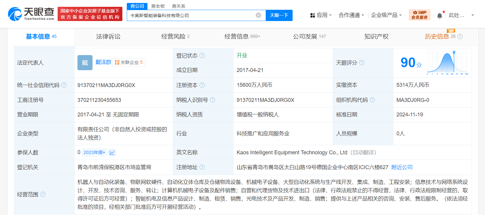 该公司成立于2017年4月,法定代表人为戴泽群,经营范围含机器人与自动化装备、物联网软硬件、自动化立体仓库及仓储物流设备、机械电子设备、大型自动化系统与生产线开发、集成、制造、工程安装,信息技术与网络系统设计、开发、技术咨询、服务、转让等。股东信息显示,该公司由海尔集团旗下卡奥斯物联科技股份有限公司全资持股。