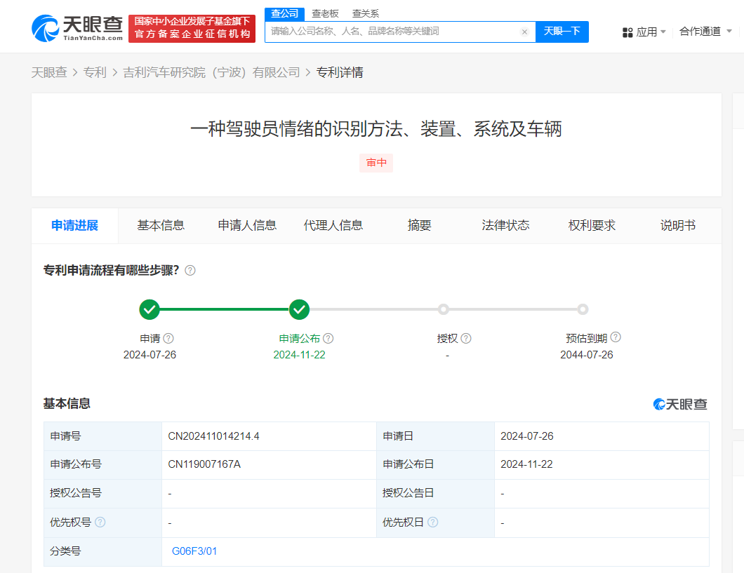 天眼查知识产权信息显示,11月22日,浙江吉利控股集团有限公司、吉利汽车研究院(宁波)有限公司申请的“一种驾驶员情绪的识别方法、装置、系统及车辆”专利公布。