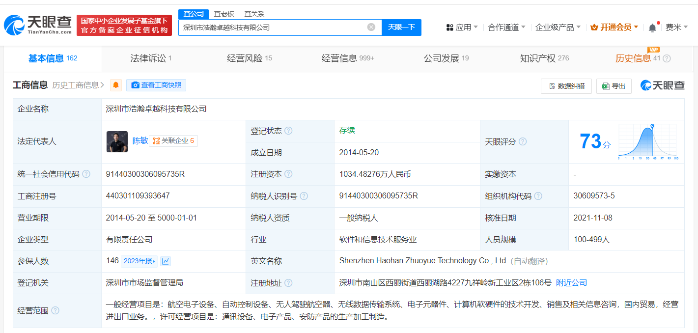 深圳市浩瀚卓越科技有限公司成立于2014年5月,法定代表人为陈敏,注册资本约1034.5万人民币,经营范围含航空电子设备、自动控制设备、无人驾驶航空器、无线数据传输系统、电子元器件、计算机软硬件的技术开发、销售及相关信息咨询,国内贸易,经营进出口业务等,现由陈敏、深圳市浩瀚共创投资合伙企业(有限合伙)、深圳市思普仑听文化科技有限公司及上述新增股东等共同持股。官网显示,该公司深耕于智能影像领域。